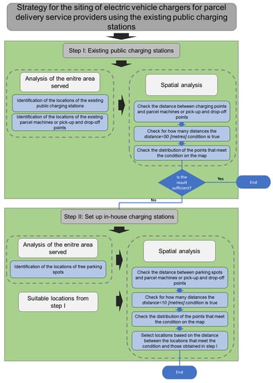 Figure 1 is a diagram representing the first strategy, in which public charging stations are assumed to be used. This strategy comprises two steps: the first entails testing the feasibility of using public stations, while the second makes it possible to determine the potential sites for in-house charging stations if the first step fails to meet the relevant expectations.