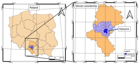 Using the method proposed for the above two strategies, a case study was performed in the city of Katowice, located in the central part of Silesian Voivodeship in southern Poland. The case study considered machines operated by a delivery company where parcels can be dropped off and picked up. The delivery company in question was a nationwide operator. The territory subject to the analysis was narrowed down to that of a single city with an area of 164.6 km2 and a population of about 290,000 [44]. Figure 3 shows the case study area against the entire country and the whole of the voivodeship (province), and it highlights the neighbouring towns that altogether form an urban area known as Metropolis GZM (the Metropolis of the Upper Silesia and the Dąbrowa Basin), which is inhabited by ca. 2 million people.