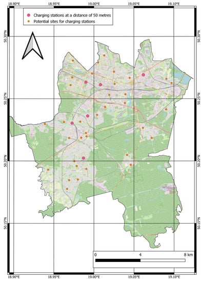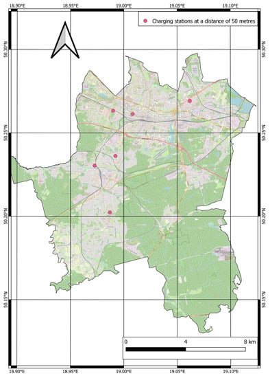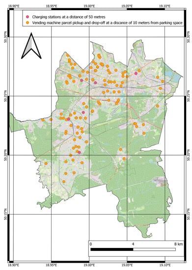 A spatial analysis was performed to check the distance between the charging stations and the parcel service points. Given the current conditions, couriers tend to arrive as close as possible to such a point to avoid the extra time needed to handle parcels. A distance between charging points and parcel machines or pick-up and drop-off points of 50 m was assumed for a courier to be able to move parcels onto a special transport trolley as well as to place parcels inside the machine and to remove those already dispatched from the locker while the electric vehicle is charging. If the decision maker should modify their approach, the 50 metre value can be changed to any chosen one (while the strategy remains functional).