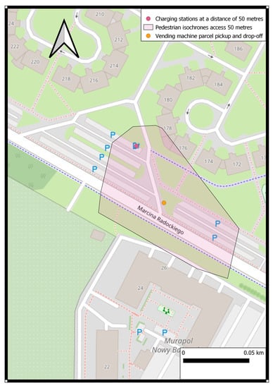 In order to better illustrate the example of the siting of the charging stations that met the condition of a walking distance of less than 50 m from the location of a machine where a parcel could be dropped off or picked up, a magnified view of one of the six conforming stations is provided in Figure 5.