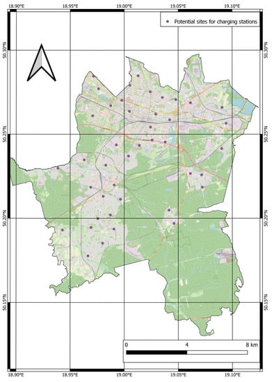 Next, locations of the machines used to drop off and pick up parcels were identified. There are 209 such points within the territory of Katowice. Since the envisaged fraction of the parcel machines covered by the charging stations was 20%, it was further assumed that 42 charging stations should be deployed (which pertained to both the first and the second strategy).