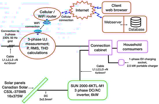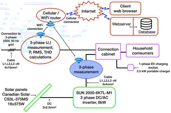 To detect the source of harmonics, the measurement system was updated (Figure 8) with an additional second identical power meter directly at the grid-tied inverter’s output.