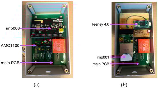 (a) Basic power meter (imp003); (b) upgraded power meter (Teensy 4.0 and imp001).