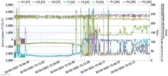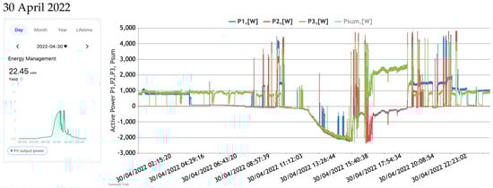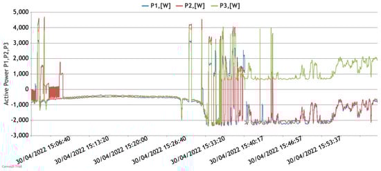 Figure 9 reflects the active power profiles registered at each phase separately—at the grid connection and at the inverter’s output.