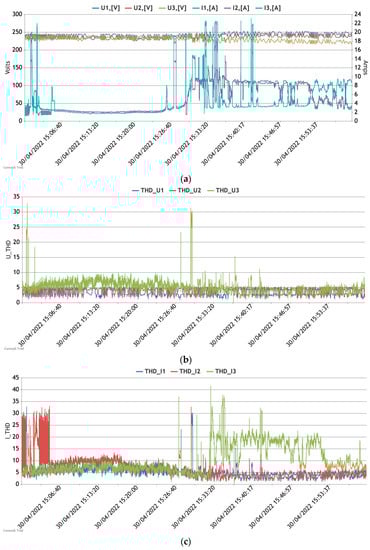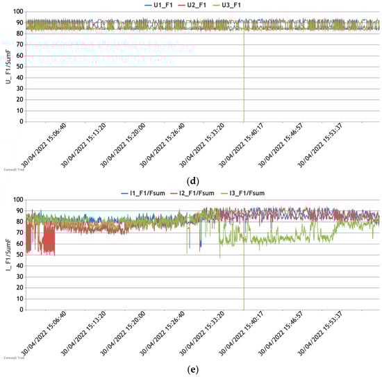 (a) Registered voltages and currents; (b) calculated THD for phases U1, U2, and U3; (c) calculated 1st harmonic value against the sum of all harmonic values for phases U1, U2, U3; (d) calculated THD for phases I1, I2, and I3; (e) calculated 1st harmonic value against the sum of all harmonics values for phases I1, I2, and I3; (see also https://remotelab.lv/power/powerD2_THD.php (accessed on 1 March 2023); please note that the webpage is slow to load).