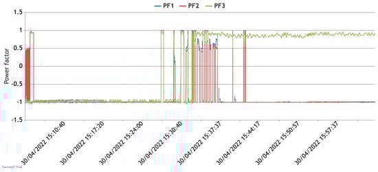 The power factor values in Figure 10 are positive or negative depending on the direction of energy flow. The power factor values are mainly close to 1. The exception is when the water pump’s motor periodically starts and stops, or other load transients occur, causing the power factor to drop below 1.