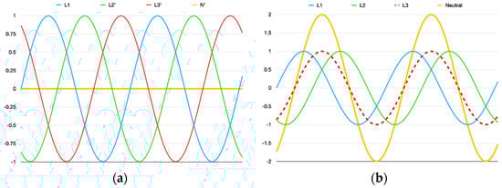 Balanced Y grid neutral current (a) and case in which in two phases energy is fed into the grid and in one phase energy is consumed from the grid (b).