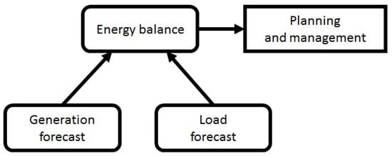 - Energy balancing in the entire system, its selected area, region, energy community, etc., resulting from technical needs, e.g., to maintain system stability, to prevent overloading, to maintain the high quality of energy supply, to efficiently use energy and manage its flows in the supply networks, as well as from network development planning (Figure 1);