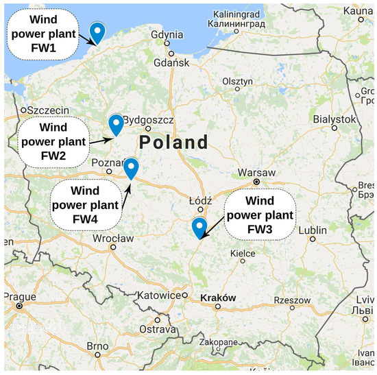 - Wind power plant No. 4 (FW4), located in central-western part of the country, whose total installed capacity equals 1.0 [MW], comprises a single turbine, and therefore, local wind variability directly affects changes in the generating unit’s output. That hinders the forecasting process, and therefore, it was decided to include it in the analysis.
