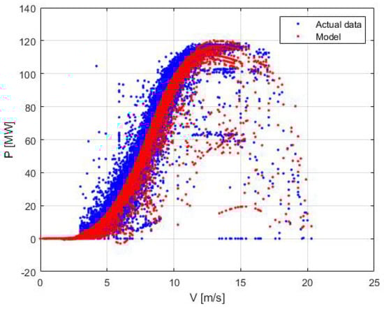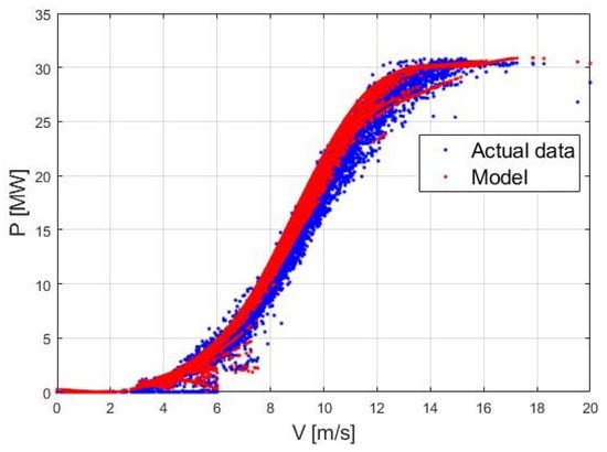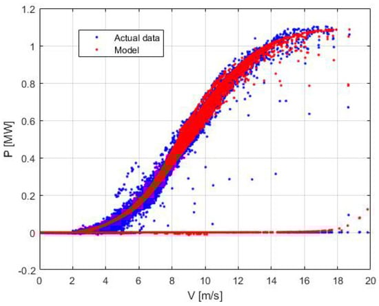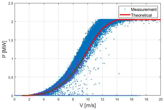 The actual as-measured data (in blue) and theoretical data (in red) of wind turbine E70 power characteristics, wind power plant FW3 [].