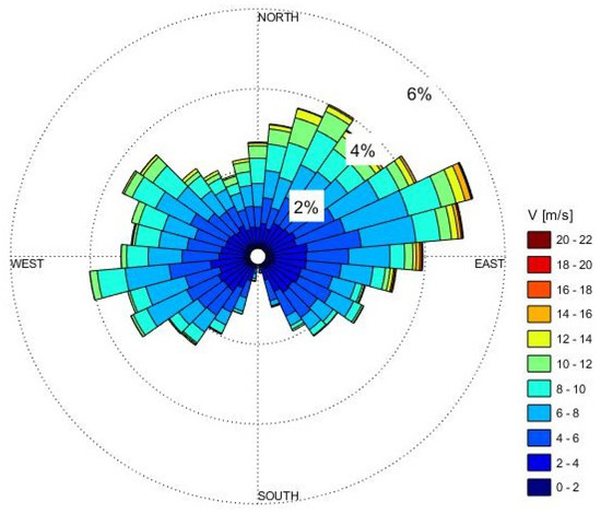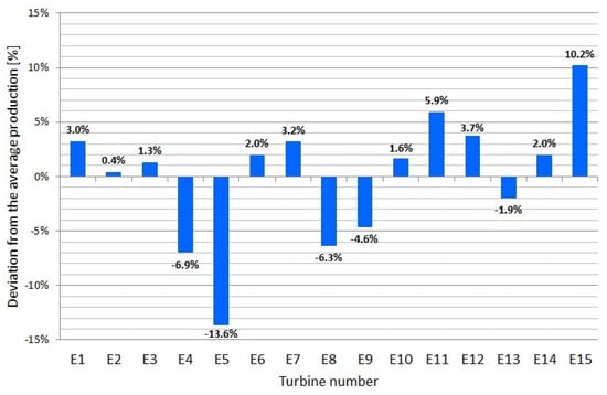 The wind velocity distribution within the wind farm, even though it is located in a relatively small area (270 ha), is not even. This is shown by Figure 4, presenting the annual deviation from the average electricity production for the respective turbines E1–E15 comprising wind power plant FW3.