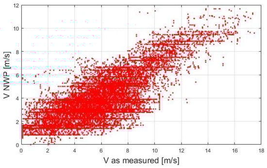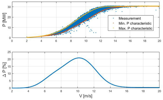 Figure 3 presents the declared power characteristics of an example wind turbine of power plant FW3 prepared on the basis of the manufacturer’s documentation [] and as-measured historical data.