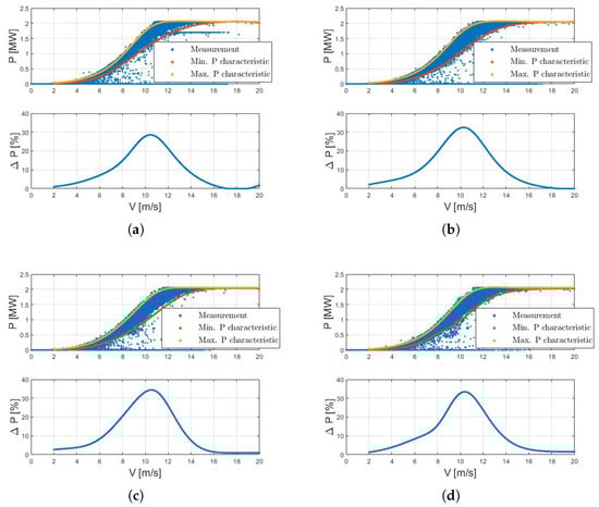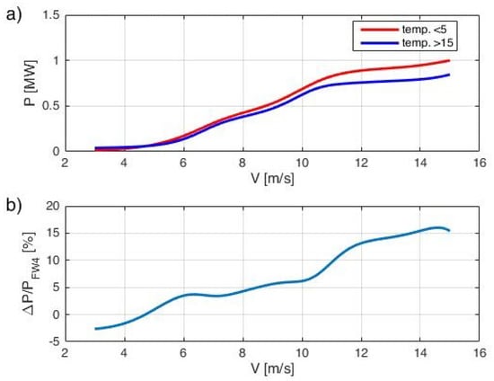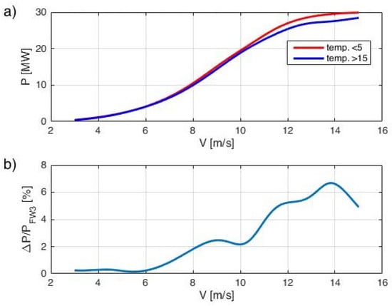 It follows from Figure 8 to Figure 10 that temperature affects the shape of the wind power plant power characteristic. In the case of wind power plant FW3, the largest difference is for the wind velocity of 9.4 m/s and is equal to 1.63 MW. That represents over 8% of the wind power plant’s rated output. The differences for wind power plants FW1 and FW4 grow bigger as the wind velocity increases, reaching as much as 10–15% of the power plant’s rated output.