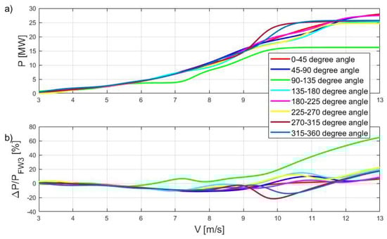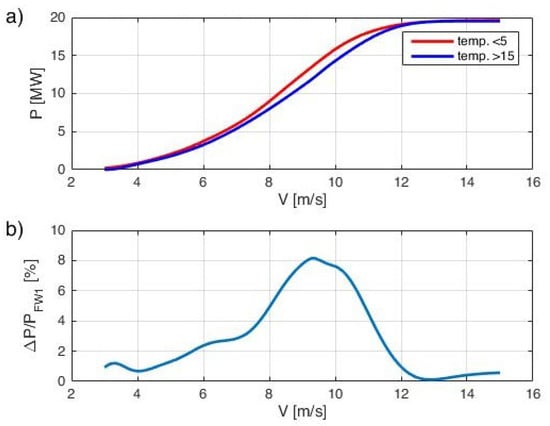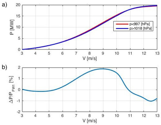 Wind power plant FW1: (a) power characteristics for hPa and hPa, determined using neural networks, (b) power plant power difference for both cases as percentage of the farm’s rated output.