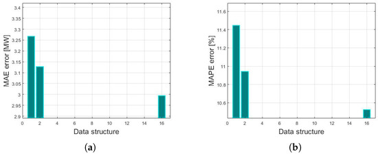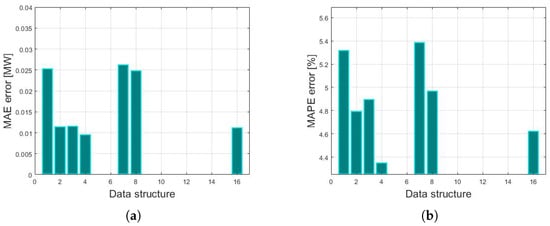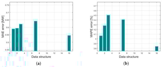 An example of a neural network-based hybrid model with regressive error propagation is described in paper []. The authors of the paper effectively used that type of network in combination with NARX (Non-linear Autoregressive with External Input). NARX network models perform better with short-term forecasts, whereas network-based models with regressive error propagation ensure better results for longer forecasting horizons. The following was used for the forecasting: real-time production, structural information, NWP (Numerical Weather Prediction), and power forecast from various providers.