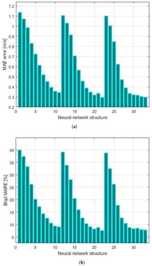 To improve the forecasting accuracy, hybrid models are used that combine the advantages of both model types. A practical example of a hybrid forecasting model is described in paper []. A model presented there is dedicated to the energy production prediction for fourteen wind farms. The proposed hybrid model, combining neural networks and vector machines, was compared with other models based on either neural networks or vector machines only. Paper [] describes ANN (Artificial Neural Networks) learning on the basis of historical data covering one year. The model considers wind velocity and direction as parameters underpinning the volume of energy production. A simple neural network was proposed, consisting of a single hidden layer, because adding new layers did not improve the results. There were from 15 to 25 neurons in the hidden layer, depending on the wind farm for which the forecasts are made. It follows from the observation of the authors of [] that the qualitatively worst forecasts covered the power plants located in rough terrain.