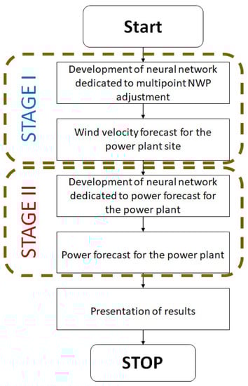 Many statistical models can be distinguished, e.g., WPPT, FUGS, and other models described below. They were selected on account of a different approach to the data processing and forecasting process. Authors of the papers referred to above proposed their own forecasting methods based on individual input and verification data sets. The WPPT (Wind Power Prediction Tool) model [] allows the forecasting of energy for a time horizon of up to 48 h, and a resolution of 30 min. Numerical weather forecasts are used for the forecasting, as well as wind farm measurement data updated on an ongoing basis, which can update the non-linear model on a continuous basis. The model combines two approaches by forecasting the output of the individual turbines within the farm and the output of the entire wind farm.