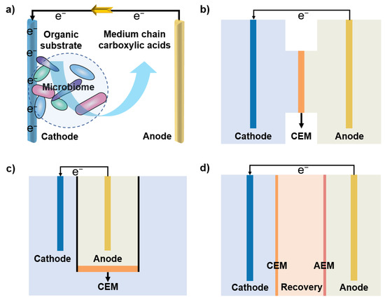 To sum up, an H-type reactor is usually used in the fundamental research stage at the laboratory scale, and a bottle-type reactor is more suitable for the pilot scale. Given the subsequent downstream separation and purification process, more advanced reactor configurations such as a three-chamber reactor (Figure 1d) [53,54], which has a third chamber beyond the anode and cathode chamber, i.e., separation chamber, seem more appealing. Future studies should focus on the reduction of internal resistance, the improvement of current density, and the long-term stable operation of the MCCAs electrofermentation reactor. Meanwhile, advanced methods of MCCAs in situ separation in bioreactors also need to be developed to improve the reactor efficacy by preventing MCCAs toxicity from chaining elongation, elevating the MCCAs concentration considerably, selecting the longer possible carbon chain, and building mildly acidic circumstance of the fermentation solution to also inhibit unwanted side reactions (e.g., acetoclastic methanation).