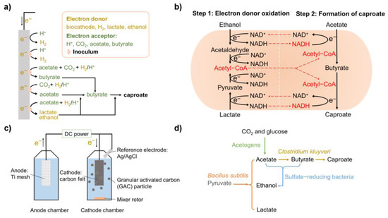 (a) All possible pathways occurring in MCCAs bioelectric production systems with acetate and CO2 as substrates [43]; (b) reverse β oxidation mechanism and electron transfer direction [24]; (c) schematic diagram of fluidized cathode electric fermentation system [50]; (d) cooperation of microorganisms in bioaugmentation systems [44,45,61,71].