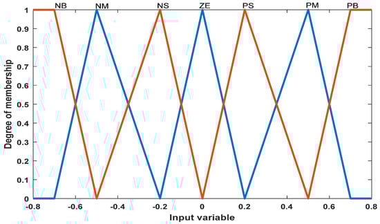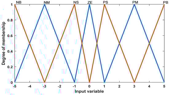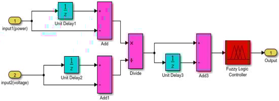 In this section, a fuzzy controller with two inputs (power and voltage) and one output (one output unit) is designed (Figure 2 and Figure 3). The main advantage of the fuzzy controller is that it does not need accurate information about the system. The Mamdani fuzzy model is used in the fuzzy controller, and if–then rules are used for the inference engine. Table 1 and Table 2 show the fuzzy controller designed for the system based on the control law, fuzzy variable language.