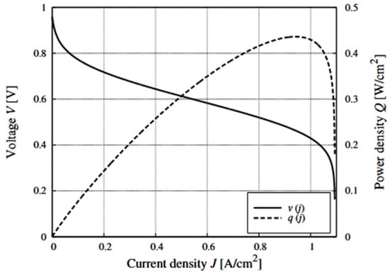 Voltage v and power density q of a single fuel cell typical element versus its current density j. The voltage varies from about 1 V to about 0.5 V when the power increases from zero to its maximum value.