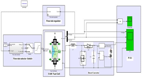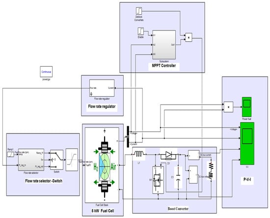 Figure 6 shows a single simulation of the system under study, which has a fuel cell, a boost converter, and a load. The information from this model is given in Table 3. The aim is to investigate the power of two loads in two scenarios. The main purpose of using a fuel cell is to generate electricity, while a secondary goal could be to utilize the heat generated by the reaction. Therefore, the electrical energy generated by the fuel cell must be easily usable by the consumer, who, in practice, cannot be connected directly to the fuel cell, as its output voltage is DC, and consumers are usually AC. In this sense, to use the electrical energy output of the fuel cell, a power optimization unit must be used to produce the adequate voltage.