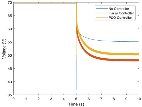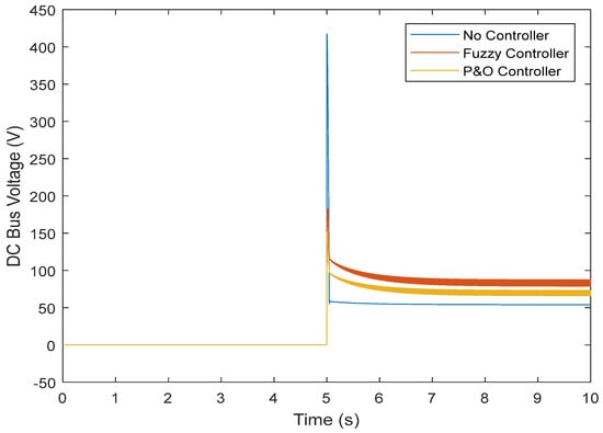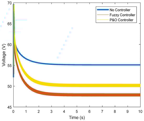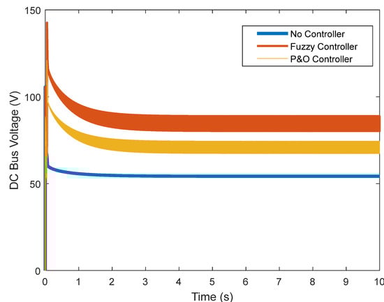 This section examines the results obtained while using Perturb and Observe (P&O) and the fuzzy controllers. According to the data, the voltage in the normal state is 45 V, which is well depicted in Figure 10. It can be observed that, in the absence of control strategies, this voltage exceeds the limit.