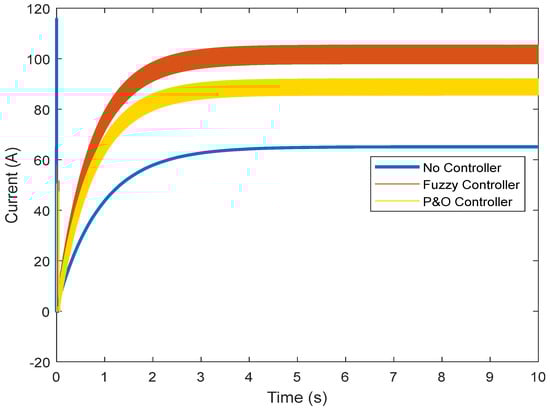 Both voltage controls approximate the current to the nominal value of the fuel cell, which is 111.3 A. Figure 11 shows that, without the controller, the current is very low (60 A). In the presence of the fuzzy controller, the current improves and comes close to the nominal value.