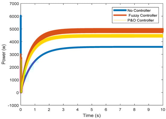 Figure 12 shows the power of the fuel cell with and without a controller. The voltage and current have been successfully controlled in the previous steps, and the nominal values have been reached. The voltage and current control, through which the rated power of the fuel cell (5000 W) has been reached, is clearly visible.