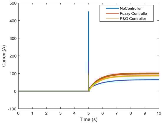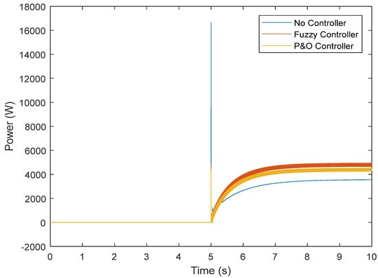However, the fuzzy controller prevented large voltage drops, and the nominal value was reached. Figure 16 shows the results obtained regarding the current. It can be seen that without the controller, there is a high current while connected to the load, which does not reach the normal state after some time. The controller was able to prevent the high current, and the normal state was reached after connection. By controlling the current and voltage, the power was also controlled (Figure 17). Figure 18 and Figure 19 show the current and voltage of the boost converter. It is important to point out that if the current of the converter is not controlled, the converter will be seriously damaged (it might even burn). According to the results, a normal operation of the converter in the transient state was also achieved.