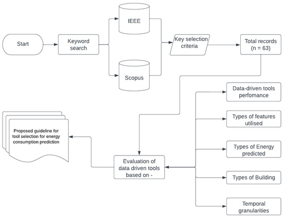 To address this gap, this study aims to deliver a structured review of the performance of data-driven tools, such as Artificial Neural Network (ANN) [26], Random Forest (RF) [27,28], and Linear Regression (LR) [13], among others, employed for the prediction of building energy consumption to identify the optimal tool in different conditions. This study focuses on evaluating the performance based on the following conditions: type of building used, type of energy predicted, and type of features used, among others, in the various studies; and delivers a discussion of the findings; a guideline for tool selection; and proposes future research directions. This study is structured as follows. Section 2 delivers an abridged overview of the existing review articles in the field of building energy prediction and pinpoints the gaps. Section 3 explains the methodology utilized in this study. Section 4 discusses the selected studies based on the features selected, the type of energy, and the type of building, among others, and it also delivers the proposed framework for tool selection. Lastly, Section 5 conveys the conclusion and future research directions.
