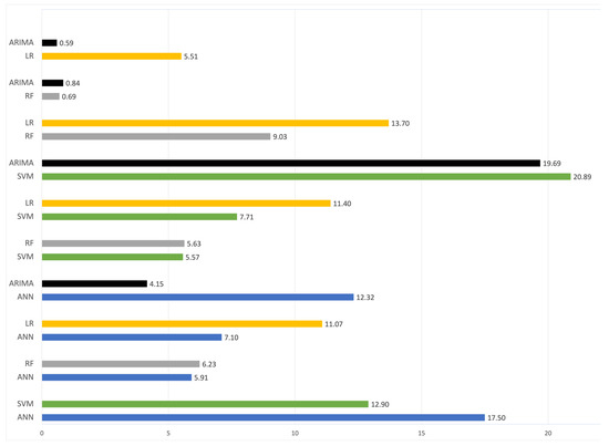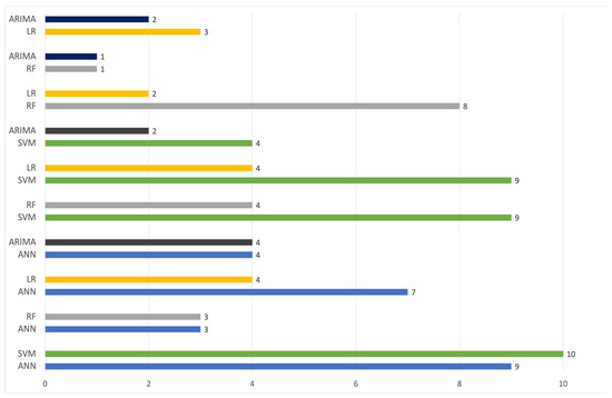 The results from Figure 3 and Figure 4 show that SVM outperformed other tools such as ANN, LR, RF, and ARIMA. Figure 4 shows that AI-related tools such as SVM, ANN, and RF produced better performances in more studies than statistical tools such as LR and ARIMA.