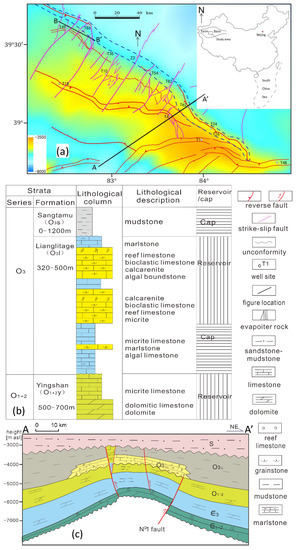 A tectonic sketch of the Ordovician carbonate top (a), the Middle-Upper Ordovician strata column (b) and the reservoir model of the Upper Ordovician (c) in the Central Uplift (revised after References [13,28]).
