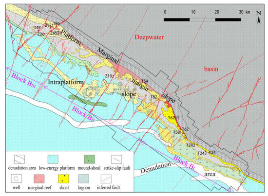 However, there are still more segments of the microfacies and reservoirs along the platform margin that could correlate with the strike-slip faults (Figure 4, Figure 9 and Figure 10). There is a large number of distinct large fracture-cave reservoirs in the reef-shoal complex, as shown by the seismic description (Figure 7g) in the T62 block [13], but sparse fracture-cave reservoirs in the eastern area. It has shown that the strike-slip faults have separated Block T62 from its adjacent blocks (Figure 4). Importantly, the fractured reservoirs generally occurred along strike-slip fault damage zones in the central and western segments (Figure 9). The blocked reef-shoal bodies and reservoirs could be correlated with the strike-slip faults rather than with the thrust faults. This is consistent with the fact that recent high production wells have generally occurred in the strike-slip fault zones (Figure 10), whereas most matrix reservoirs and fractured reservoirs along the thrust fault zones could not obtain high oil/gas production.