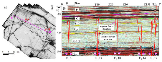 Through the 3D seismic interpretation, sixteen large strike-slip faults were identified from the seismic data, with lengths of 20–50 km (Figure 2). The major faults FI5, FI17 and FI21 are in excess of 200 km long. Horizontal displacements along the strike-slip faults are less than 600 m at the Ordovician level. In the seismic section, the strike-slip faults show simple vertical fault planes and positive- and negative-flower structures (Figure 3). Vertical throws are generally in the 30–150 m range, but can be seen to be up to 400 m in the cases of the trans-tensional grabens. Transpressional faults formed in the Cambrian-Ordovician carbonates show a positive-flower structure, but trans-tensional structure in the overlying strata. Most strike-slip fault zones spread upward into the Devonian, only a few fault zones extending into the Permian. The inherited strike-slip faults in the Silurian-Permian are short trans-tensional in echelon faults, with vertical displacements of 200 m at the Silurian level, and of less than 100 m at the Carboniferous-Permian level.