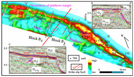 Separated by the strike-slip faults FI21 and FI19, the reef-shoal complex is divided into three segments along the platform margin (Figure 2). In the eastern segment, a rimmed platform margin has developed along the thrust fault belt [12,19]. A relatively narrow (<2 km width) but thicker (more than 500 m) group of shoal bodies has formed in the eastern T24 block, and has progressively turned into wide high-energic reef-shoal bodies in the western T62 block (Figure 4). The two blocks are separated by a small NE-trending strike-slip fault zone. It may be noted that there are signs of intense thrust fault activities rather than a weaker strike-slip faulting after the carbonate deposition (Figure 4). In the central segment, it became a weak rimmed or non-rimmed platform margin. The broad high-energic facies is mainly composed of shoal bodies, but shows a lack of reefs. The central segment is also divided into two areas by FI21. The eastern part is wider with higher energic shoal bodies than the western area. In the western segment, there are progressively wider but lower energic shoals along the platform margin. Additionally, more strike-slip faults have intersected the platform margin of the Upper Ordovician.