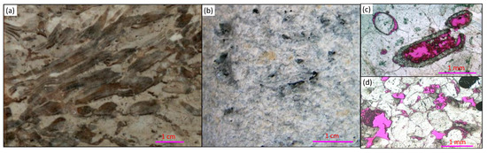 The Ordovician reefs include porifera, stromatoporoid and coral framestones [19,20,21,22]. The porosity in these relatively small reefs is generally filled with lime-mud and fine bioclastic (Figure 5a). Furthermore, the framework porosity has been almost lost due to cementation. Sparse dissolution porosity developed along the framework pores, and some intragranular dissolution pores were observed in the reef fragments in the eastern segment (Figure 5c). Generally, the connectivity of the intragranular porosity is too weak to allow the development of favorable dissolution reservoirs. In contrast, we found that further intergranular dissolution porosity developed along the bioclastic and calcarenite around the reefs (Figure 5b,d). The intergranular dissolution vug (diameter between 2–100 mm) and pore (diameter < 2 mm) occur mainly in grain stones. It has developed well in the reef-shoal limestones along the platform margin, particularly in the eastern segment. Although most of the primary porosity has been lost by intense cementation during the long burial history, most dissolution porosity seems to have occurred alongside the primary porosity in these reservoirs. Dissolution pore-vugs in cores are generally paralleled along strata bedding with layers tens of cm thick (Figure 5b). The multiple dissolution intervals can be composed of layers several meters thick in the reservoir that is the major drilling target in the matrix reservoir along the reef-shoal complex. It was shown that the high-porosity reservoirs generally occurred along the eastern thrust fault belt and the strike-slip fault zones.