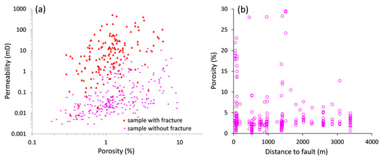 Porosity-permeability correlation from the core plugs (a) and average porosity of a well reservoir interval vs. distance to fault (b) by logging interpretation in the Ordovician reef-shoal reservoirs.