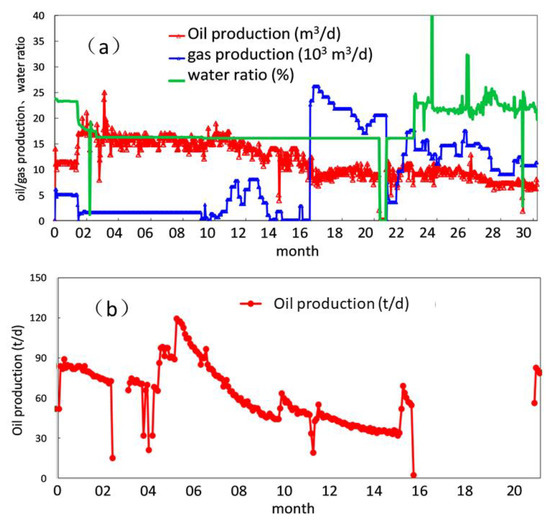 The typical production curves of the matrix reservoir (a) and fracture-cave reservoir in the oil production wells (b).