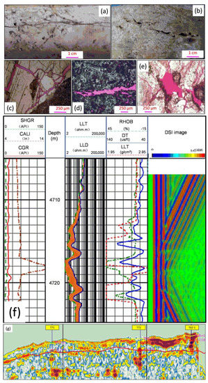Alongside the reef-shoal complex of the platform margin, fracture networks developed along fault damage zones (Figure 8). Generally, fractures have high angles and narrow apertures (Figure 8a). Multiple sets of fractures form a complex fracture network, especially in inner fault zones. Fracture frequency varied widely from 1 to 17 m in cores and FMI images. Few wells intersecting inner fault damage zone penetrated breccias. Although most fracture porosity has been filled with calcite cements and argillaceous material, many fractures are still opened and show porosity (Figure 8a–e). Dissolution porosity occurred along fractures, which led to increased fracture opening width (Figure 8b,d). Importantly, increased dissolution porosity and vugs developed along fractures (Figure 8a,e).