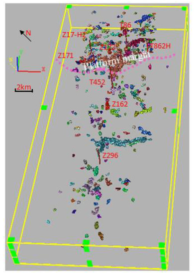Finally, 12,000 km2 of 3D seismic data were obtained on the northern slope of the Central Uplift. Pre-stack time and depth migration datasets were used for fault mapping and the identification of large fracture-cave reservoirs [14,34,35]. Enhanced coherent and maximum-likelihood attributes were used to map the small fault [14]. Seismic amplitude and structure tensor attributes were used to describe the large fracture-cave reservoir [13,14].