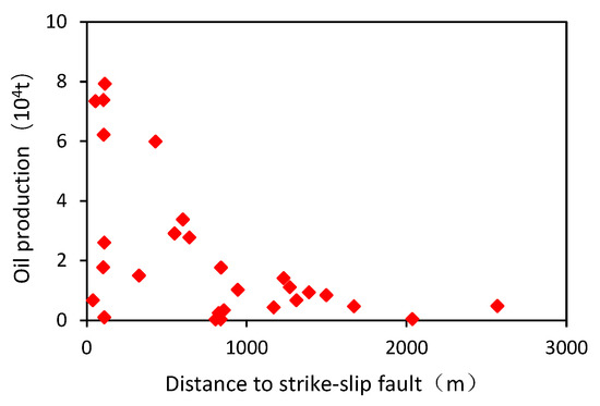 The oil production of the carbonate rocks vs. distance to strike-slip fault in the western area.