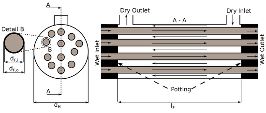 A sketch of a hollow humidifier geometry is schematically depicted in Figure 1. In the sketched geometry, a small number of 12 fibres is depicted to clearly highlight the features and flow situation. A similar geometry is used in the CFD simulations in Section 4. As shown in Figure 1, the wet and dry air streams are in a counterflow arrangement to achieve high vapour transfer rates. As seen in Figure 1, the wet air stream is fed to the fibres, whereas the dry stream flows through the shell. As a result of the manufacturing process, the fibres are placed randomly inside the shell; therefore, the water transfer behaviour is expected to be inhomogeneous. The correlation of fibre placement and water distribution is investigated in the CFD results. A potting technique is used at both ends of the fibres to separate the wet and dry sides of the humidifier.