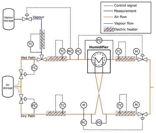 A P&ID of the humidifier test stand is depicted in Figure 2. All relevant sensors used in the test rig are listed in Table 2. Additionally, the uncertainties of the sensors specified by the manufactures are given in Table 2. The presented uncertainties are used to calculate the error propagation used in the validation process in Section 4.1.