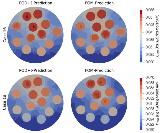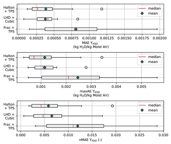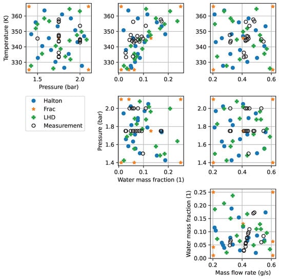 The first step in the procedure is to calculate the sampling plan, where the FOM is evaluated. Based on these results, the POD-basis is calculated. In Figure 4, the samplings of the different DoCEs are shown together with the measurement points used for calibration and validation. The mass flow rates of the CFD model are scaled to match the experiment. It is clearly visible that the fractional factorial design, which was extended by a centre point, places points in the corners of the design space. Only five points can be seen in the pair plots, except for the ones including the water mass fraction, due to the fact that always two points are sampled with the same temperature, pressure and mass flow rate. In terms of absolute humidity, seven points can be seen, which is because of the limitation posed to relative humidity, as explained above. As a consequence, the points are shifted from the right to the left part of the pair plots using the water mass fraction as the X-axis. In contrast to the fractional factorial design, the sampling points generated by the Halton sequence and the Latin-Hypercube are more evenly distributed in the design space. In the pair plots of temperature and water mass fraction, unfilled areas can be observed that result from the limitation to 100% relative humidity at the wet inlet. Both the Halton sequence and Latin-Hypercube do not guarantee that the corners of the design space are filled with points. In fact, without adjustments, no points will be placed in any corner of the design space. Hence, the choice of parameter limits should be adjusted, or additional corner points should be added manually in order to avoid extrapolation with the surrogate model.