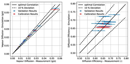 Comparison of measured and simulated vapour diffusion rates and mass transfer efficiencies. The measurement data is plotted with error bars resembling the uncertainty of the measurement.