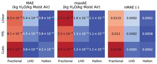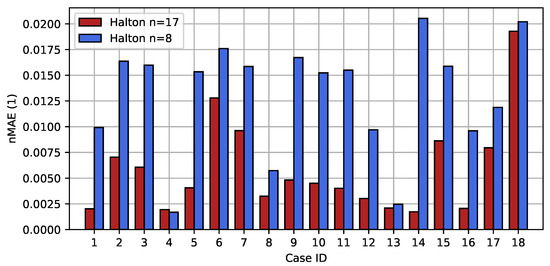 The Design of Computer Experiments is a special branch of the classical Design of Experiments (DoE) introduced by Fisher [38]. A major difference between computer and physical experiments is that many computer experiments are fully deterministic. This means that a given set of input parameters, often called factors, always produces exactly the same output in a computer experiment, whereas, on a physical test stand, the results will vary due to random factors influencing the experiment [38]. The CFD model presented above is such a deterministic model. Therefore, no repetitions of certain input sets are necessary nor specifically wanted in computer experiments [39,40]. Due to the fact that, often, a small subset of input parameters causes the major effects in the response variables, a DoCE design should avoid repetitions in all dimensions [40]. Garud et al. [41] studied different designs and analysed different space-filling criteria to judge the performance of the individual DoCEs. They conclude that Quasi-Monte-Carlo methods such as the Halton and Sobol sequence are well suited for simulations with a number of input parameters below eight [41]. In their analysis, they analyse sample counts greater than 100 [41], which are not suitable for the evaluation of the membrane humidifier CFD model. The goal of our study is, therefore, to reduce the sample points to a minimum due to the high amount of resources necessary for the evaluation of the full-order model. In order to achieve a specific design of experiments for the investigation of the humidifier, the parameters are given in the introduction. For each of the parameters, an upper and a lower limit must be defined.