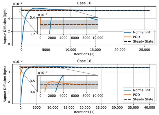 The permeability of the membrane was not disclosed by the manufacturer; therefore, a calibration using measurement results was conducted to determine the best value for the permeability of vapour. A constant value of m/s resulted in a good calibration and validation result. The calibration and validation processes utilising surrogate models as well as the simulation results are presented in Section 4.1. The membrane area available for mass transfer was calculated as the mean of inner and outer membrane area. The thickness of the membrane is m.