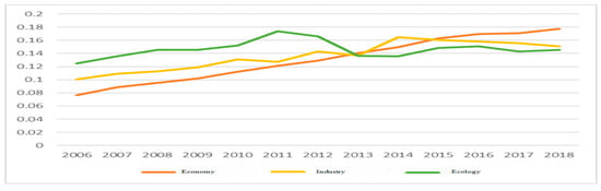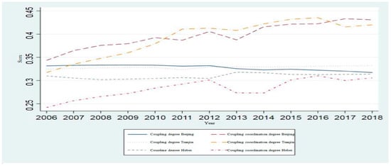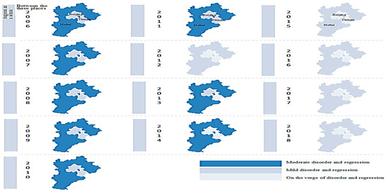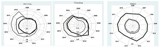 From Figure 1, we can see that although the coupling and coordinated development in Beijing decreased from 2006 to 2018, the city cluster in the Beijing–Tianjin–Hebei region reflected the inability of Beijing to coordinate high haze pollution industries, the economy and ecology which needed further optimization and adjustment. The coupling coordination degree of Tianjin was higher than Beijing from 2011 to 2016 and increased slowly after falling in 2017, signifying that Tianjin saw uncoordinated factors in the three systems in 2017. The coupling coordination degree of Hebei Province lagged far behind Beijing and Tianjin. It increased steadily from 2006 to 2012 and fell suddenly in 2013 and 2014, signifying the severe incoordination between polluting industries, the economy and the ecological environment in Hebei Province in those two years. It has increased steadily since 2015.