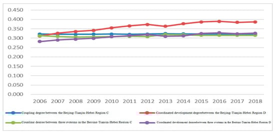 Table 1 and Figure 5 show the following. ① The overall coupling degree is better than the regional coupling degree in the Beijing–Tianjin–Hebei region. Because each subregion has its own advantageous and disadvantageous systems, at the regional level the parameters of economic growth, industry, and the environment are balanced. So, in comparison, the regional coupling degree is weaker, and the mutual complementarity makes the regional subsystem level more balanced, which in return improves the regional holistic coupling degree, but the overall high regional development level is not equally enjoyed by all regions. However, if the regions can enjoy mutual complementarity in the future, the overall regional coupling and coordinated development can be realized. ② As the coupling degree in the Beijing–Tianjin–Hebei region is high, the internal connection is close, and the three subregions boast unique functions and statuses in the regions They should therefore be able to promote regional coordinated development. ③ The overall regional coupling degree and coordinated development degree are low, mainly because the index of Hebei economic development and subsystems is low, thereby lowering the overall regional development level and making it difficult for the regionally coordinated development degree to move to a higher degree of coordination and development.